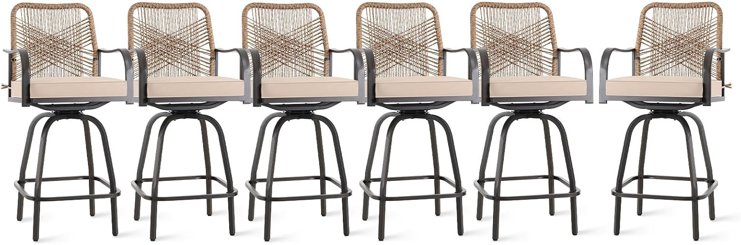 Outdoor Bar Stools Set of 6, Patio Swivel Counter Height Rattan Bar Stools, Patio Wicker Bar Swivel Chairs with Cushion, Outdoor Pool Bar Chairs for Backyard Garden Balcony w /360 Rotation