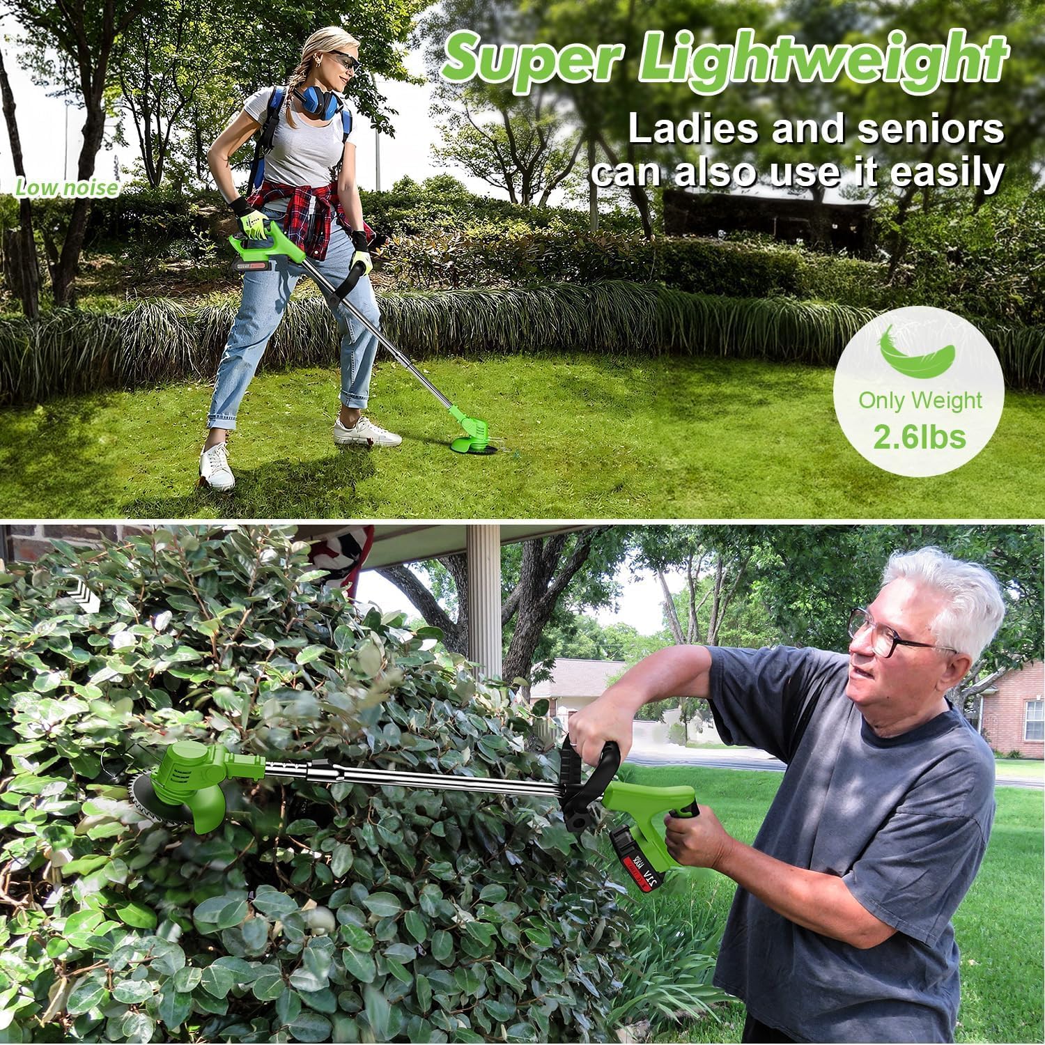 - Comfort:We know that lawn care can be strenuous, so we've built this trimmer to be your lightest and most comfortable partner in yard work. The shaft is expertly balanced and features a adjustable telescopic handle, allowing users of all heights to find their perfect, most ergonomic operating position without hunching over or straining their shoulders. The soft-grip handles reduce vibration and minimize hand fatigue, even during extended use.