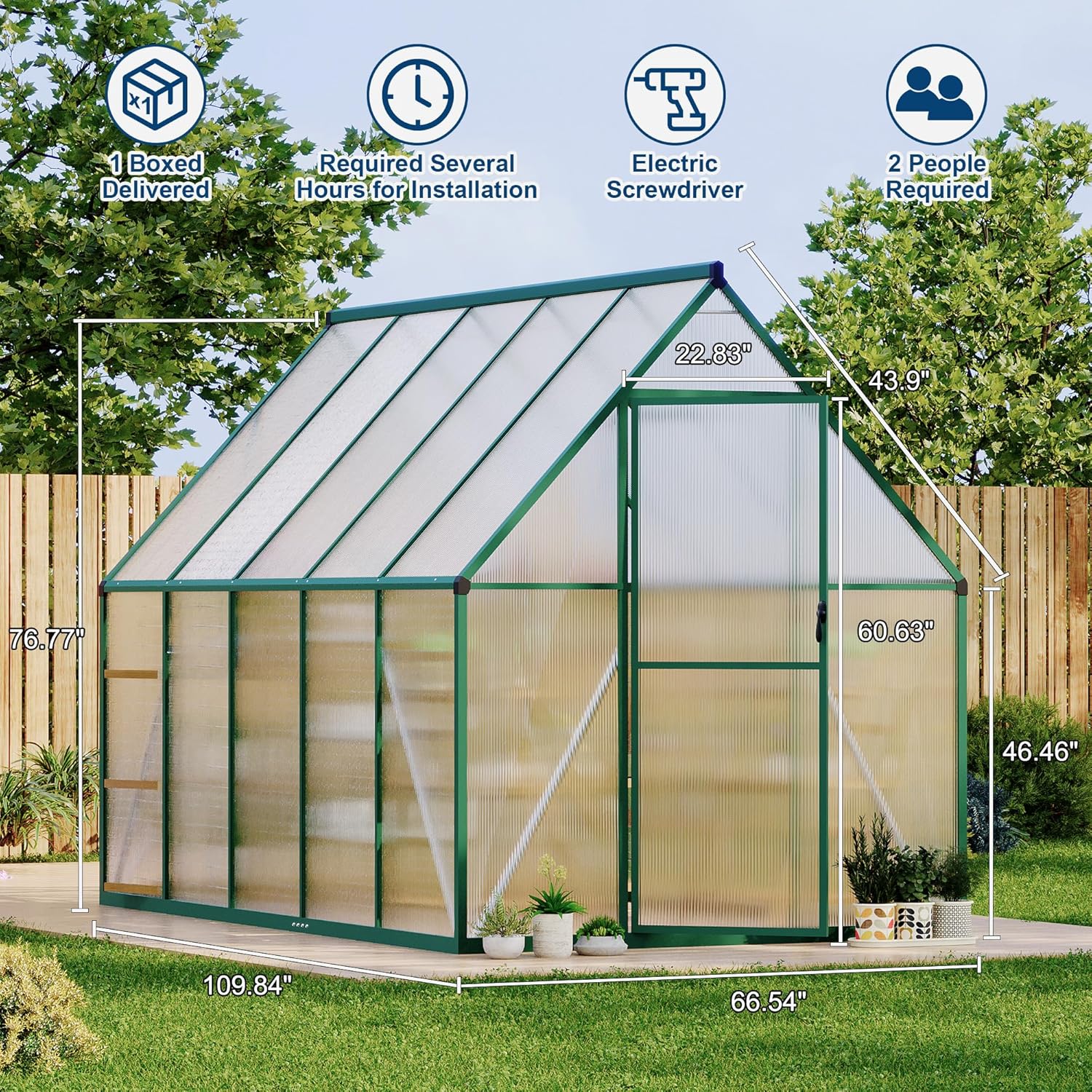 - Versatile Gardening Space - Our greenhouse not only serves as a perfect setting for plant cultivation but also can transform into a private lounge or a small guest reception room. Overall size: 109.84" W x 66.54" D x 76.77" H. Door size: 22.83" W x 60.63" H. Note that this product will be shipped in two boxes, and they might not arrive at the same time