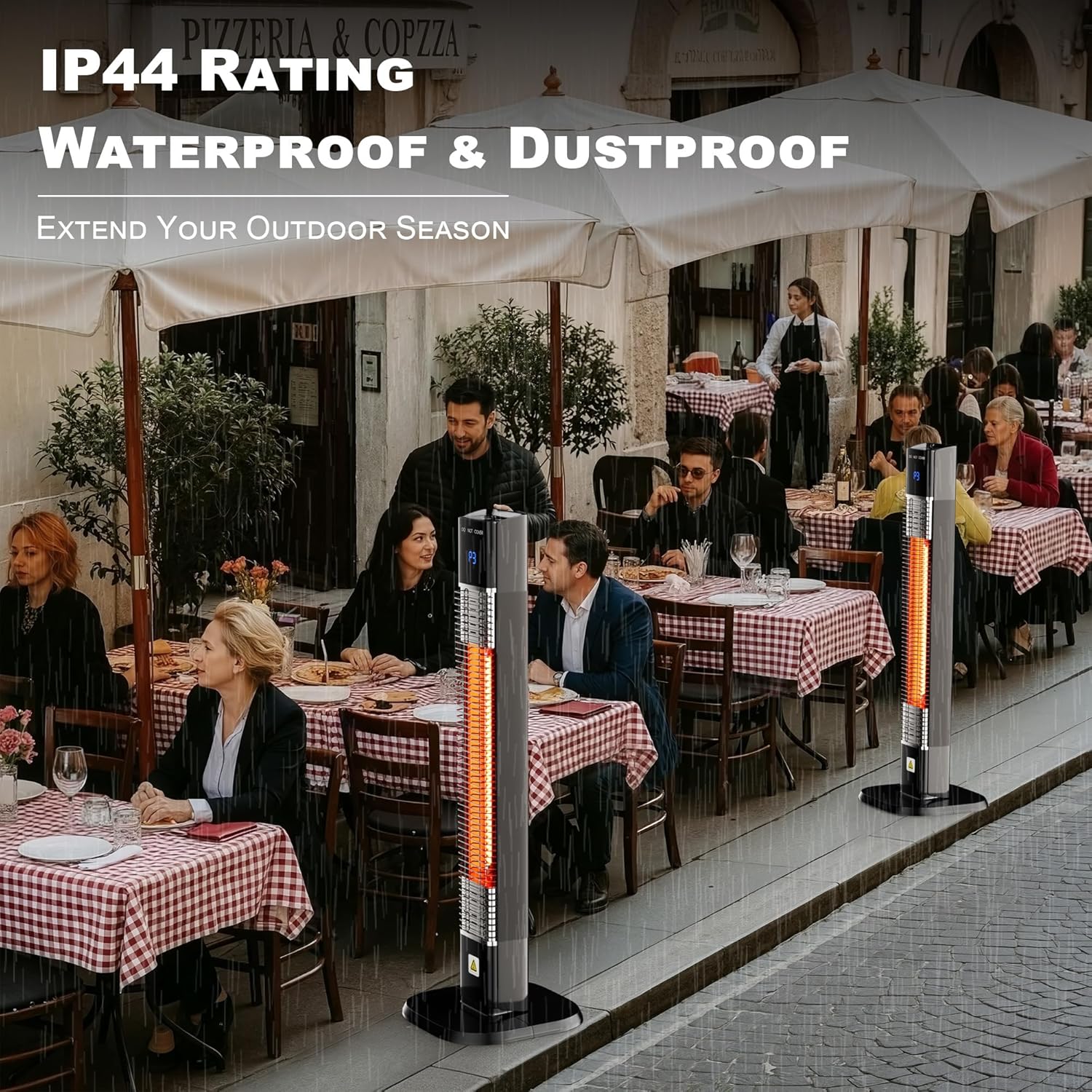 - MULTIPLE SAFETY PROTECTIONS:The automatic tip-over protection automatically shuts off the infrared patio heater if it is overturned by strong wind or impact. The heater will also automatically stop heating if it becomes overheated