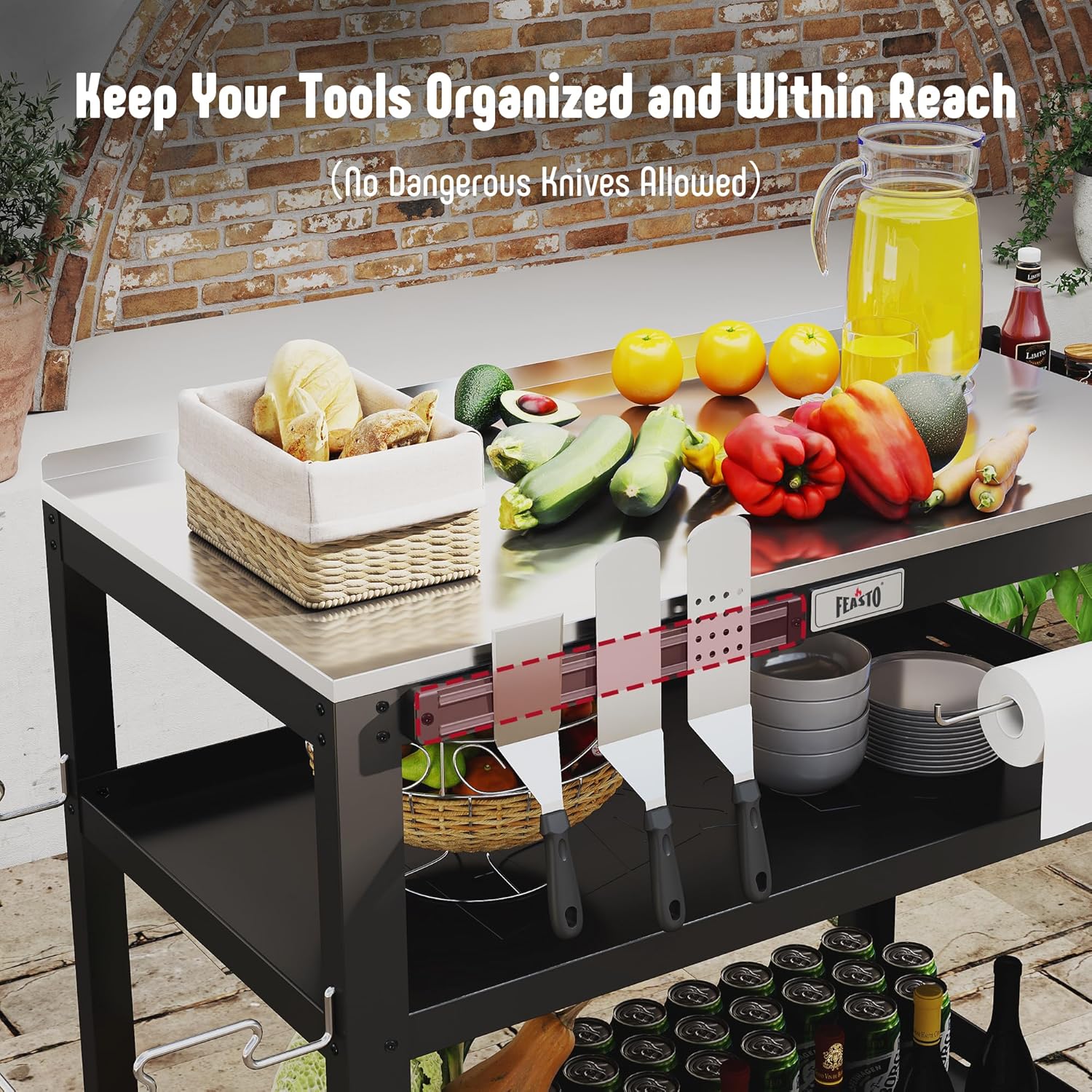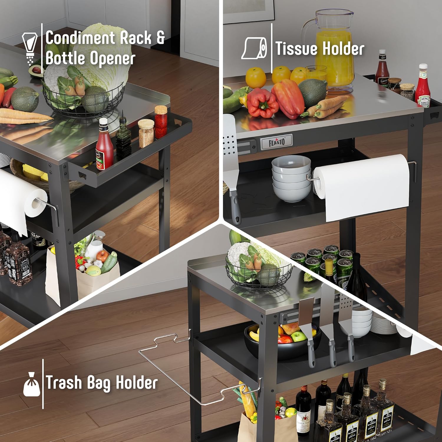 - Large Storage: The outdoor kitchen table features 3 spacious shelves,a magnetic tool holder, condiment rack with bottol opener and tissue holder & trash-bag holder keep spices, utensils, and waste within arm’s reach - no more scrambling or countertop clutter.