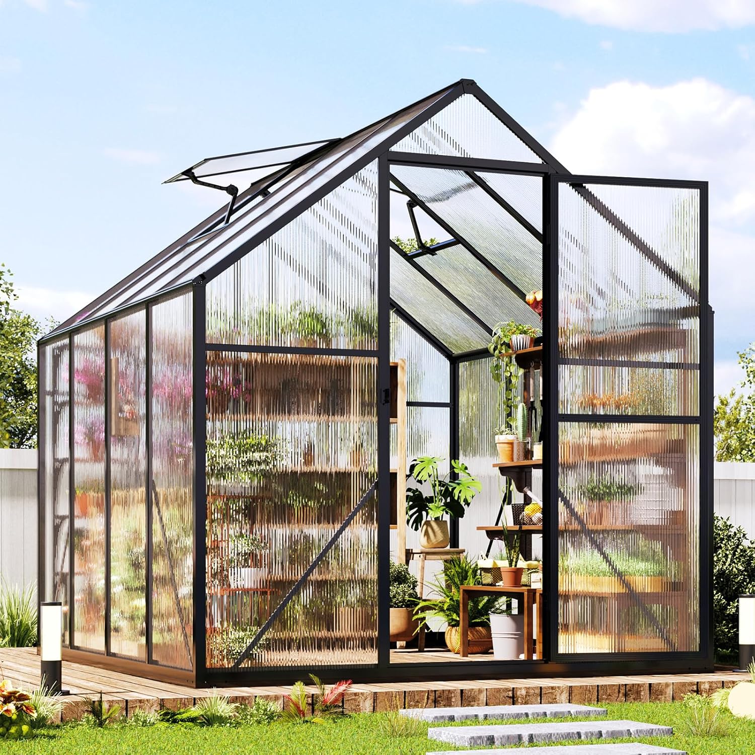 Jocisland 6x8x6.3 FT Polycarbonate Greenhouse for Outdoors with 2 Windows, Dual Swing Doors, Aluminum Walk-in Frame, Heavy Duty Garden Greenhouse for Backyard, Black