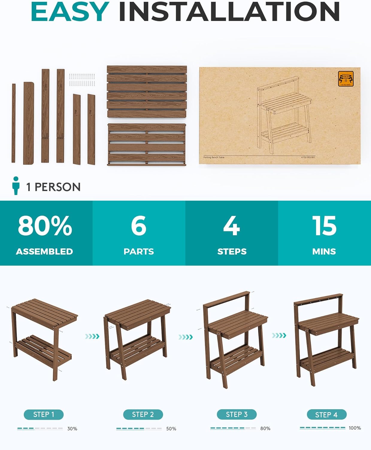 - Sturdy Stainless Steel Hardware: All hardware are made of rust-resistant 304 stainless steel, ensuring potting benches & tables remain secure and reliable through years of outdoor use.